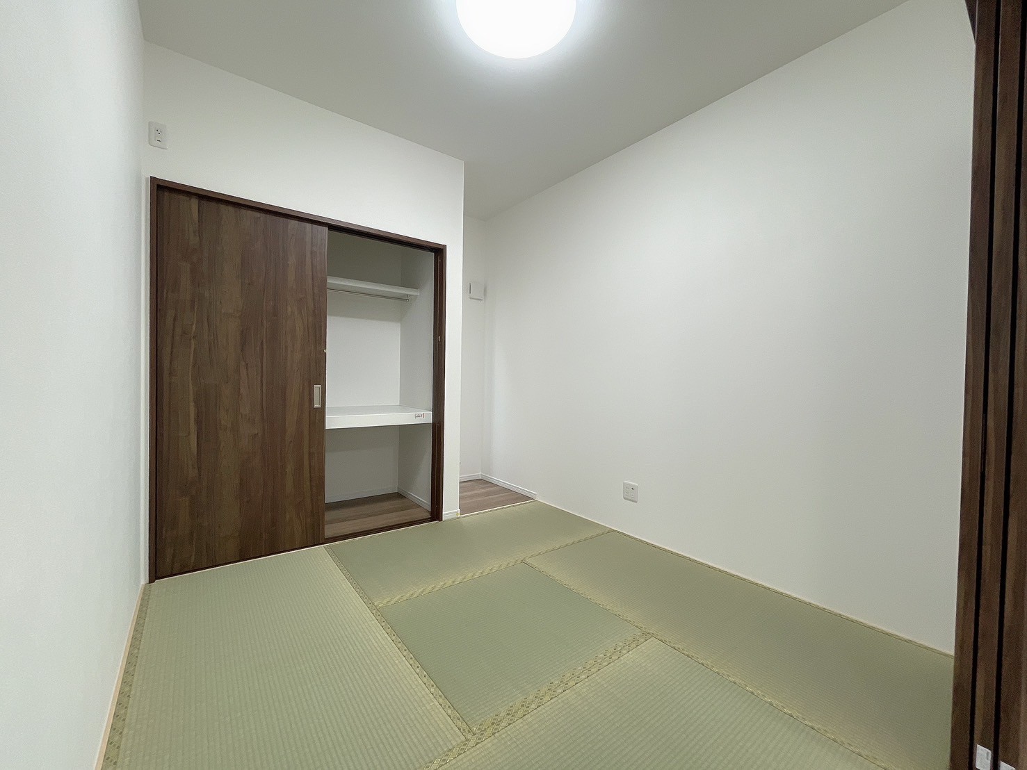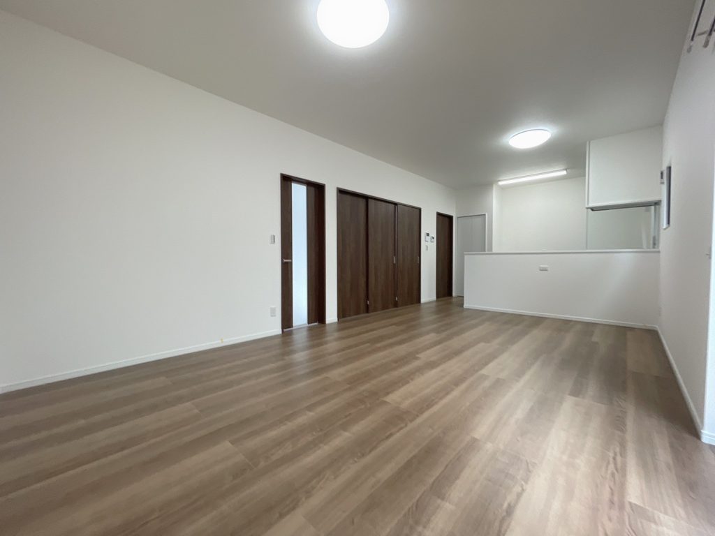 フローリングはやや明るめの木目で、温もりを感じさせつつも落ち着いた印象。木目の建具と調和し、空間全体が引き締まって見えます。モダンで大人っぽい雰囲気を演出。
