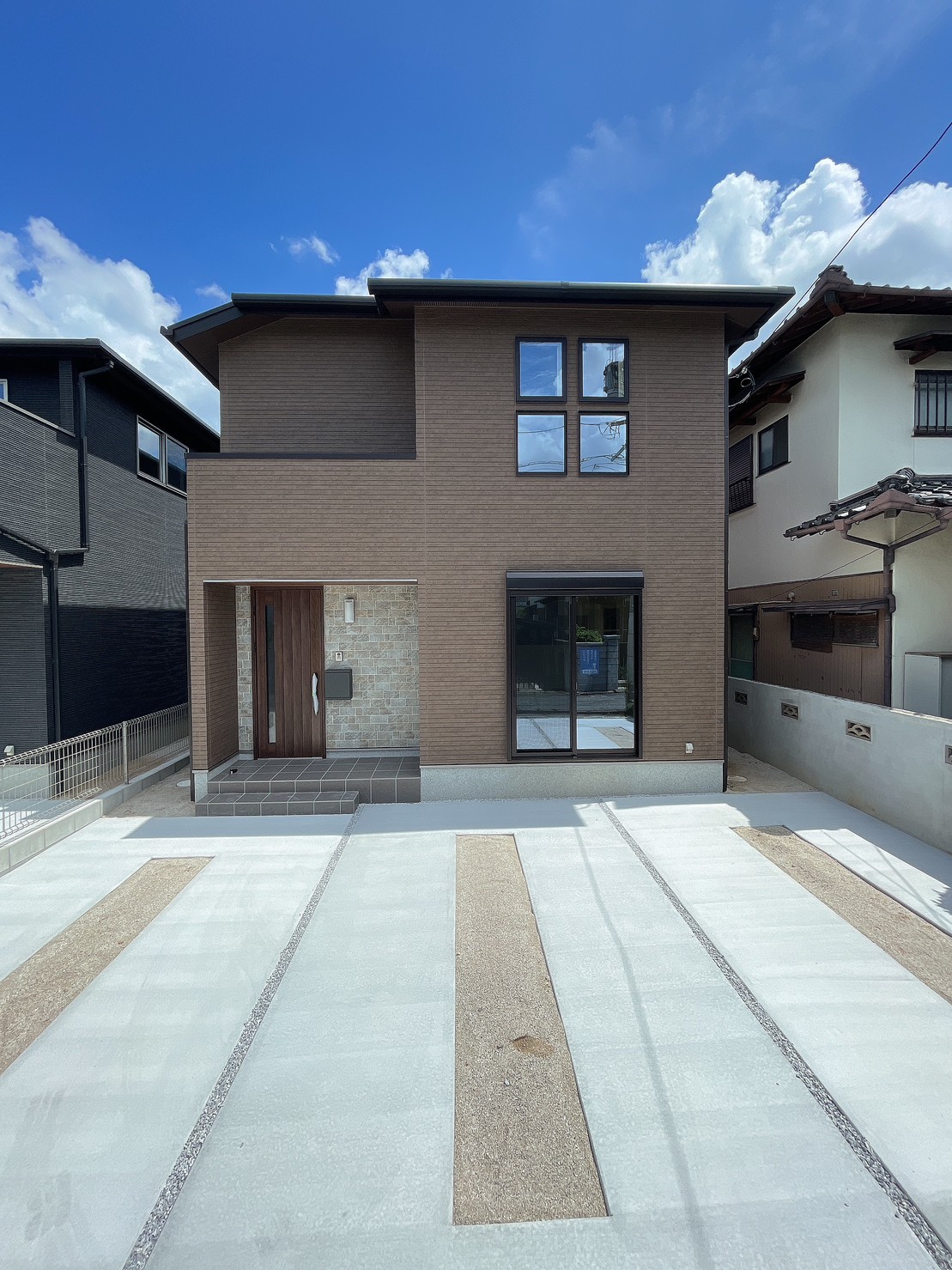 甘さも兼ね備えた上品カラー“チョコレートブラウン”の外壁に、四つ窓とレンガ調のおしゃれな玄関前の外壁が目を引く一邸です。