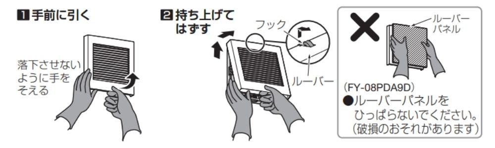 ※ 注意点:ルーバーパネル全体を前に強く引っ張らないこと。